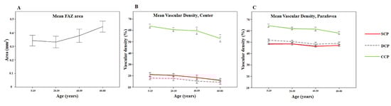 Line graph showing the relationship between age and FAZ area (mm2) (A), central mean vessel densities (%) (B), and parafoveal mean vessel densities (%) (C). Error bars represent one standard deviation.