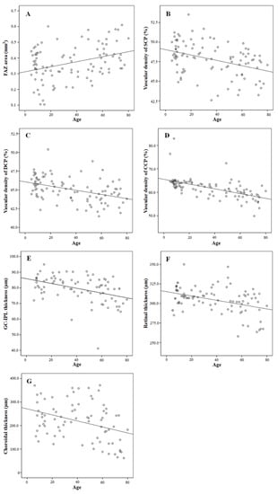 Correlation between age and other variables. The FAZ area was positively correlated with age (R = 0.350, p < 0.001) (A). (B–G) show correlations between age and OCTA and OCT variables of the parafoveal region of the ETDRS grid. The VD of the SCP (R = −0.388, p < 0.001) (B), VD of the DCP (R = −0.420, p < 0.001) (C), VD of the CCP (R = −0.590, p < 0.001) (D), GC-IPL thickness (R = −0.412, p < 0.001) (E), RT (R = −0.409, p < 0.001)(F), and CT (R = −0.354, p < 0.001) (G) were negatively correlated with age.