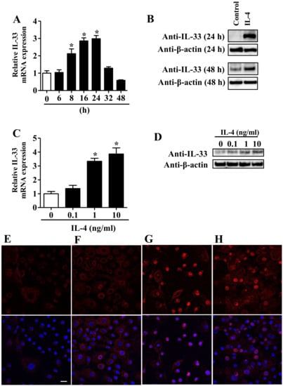 (A,B) Normal human epidermal keratinocytes (NHEKs) were treated with IL-4 (10 ng/mL) for the indicated period. (C,D) NHEKs were treated with IL-4 at the indicated dose for 24 h. (A,C) IL-33 expression was analyzed by qRT-PCR. Data are expressed as mean ± S.E.M.; n = 3 for each group. Statistically significant differences between the expression of control and IL-4-treated NHEKs are presented: * p < 0.05. (B,D) Total cell lysates were prepared and subjected to Western blotting analysis with an anti-IL-33 antibody. The data are representative of experiments repeated three times with similar results. (E) Isotype negative control: The scale bar represents 25 μm. NHEKs not treated with IL-4 (F), treated with IL-4 (10 ng/mL) for 8 h (G), or treated with IL-4 (10 ng/mL) for 24 h (H) were stained with an anti-IL-33 antibody (primary antibody) and an Alexa Fluor 546-conjugated anti-mouse IgG antibody (red: secondary antibody). DAPI (4′,6-diamidino-2-phenylindole) was utilized for nuclear staining. Confocal laser scanning images revealed increased nuclear IL-33 expression (red) in IL-4-treated NHEKs compared with that in phosphate-buffered saline (PBS)-treated NHEKs. The data are representative of experiments repeated three times with similar results.