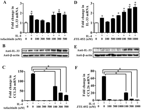 Since IL-4 activates the JAK/STAT6 axis upon binding to IL-4 receptor alpha [20], we examined whether IL-4 induced the upregulation of IL-33 expression via the JAK/STAT6 axis. For this, NHEKs were treated with IL-4 (10 ng/mL) for 24 h in the presence or absence of tofacitinib (100, 300, and 500 nM) or JTE-052 (100, 500, and 1000 nM), which are JAK inhibitors clinically utilized for the treatment of inflammatory diseases [21,22,23], for qRT-PCR and Western blotting analyses. Treatment with either tofacitinib or JTE-052 did not affect but rather upregulated IL-33 mRNA (Figure 2A,D) and protein (Figure 2B,E) levels induced by IL-4. However, treatment with either tofacitinib or JTE-052 successfully suppressed IL-4-induced upregulation of the mRNA of CCL26 (Figure 2C,F), a representative JAK/STAT6 axis-mediated chemokine [24,25] reflecting disease activity in AD [26], in a dose-dependent manner. The production of CCL26 was also evaluated by immunofluorescence staining using anti-CCL26 antibody. Treatment with either tofacitinib or JTE-052 inhibited the production of CCL26 induced by IL-4 (Supplementary Figure S4A–G). These results imply that the upregulation of IL-33 expression by IL-4 is unlikely to require JAK/STAT6 axis activation in NHEKs.