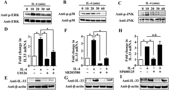 (A–C) NHEKs were treated with IL-4 (10 ng/mL) for the indicated period. Total cell lysates were prepared and subjected to Western blotting analysis with an anti-phosphorylated extracellular signal-regulated kinase (ERK)-1/2 and anti-ERK-1/2 antibody (A), anti-phosphorylated p-38 and anti-p38 antibody (B), or anti-phosphorylated JNK antibody and anti-JNK antibody (C). (D,E) NHEKs were treated with IL-4 (10 ng/mL) in the presence or absence of either U0126 (D,E), SB203580 (F,G), or SP600125 (H,I) for 24 h. (D,F,H) IL-33 expression was analyzed by qRT-PCR. Data are expressed as mean ± S.E.M.; n = 3 for each group. * p < 0.05. (E,G,I) IL-33 expression was analyzed by Western blotting with an anti-IL-33 antibody. The data are representative of experiments repeated three times with similar results.