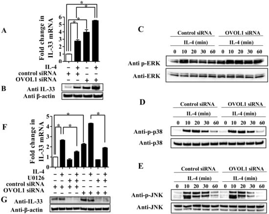 (A,B) NHEKs were transfected with control siRNA (si-control) and siRNA against OVOL1 (si-OVOL1) and subsequently treated with IL-4 (10 ng/mL) for 24 h. (A) IL-33 expression was analyzed by qRT-PCR. (B) IL-33 expression was analyzed by Western blotting with an anti-IL-33 antibody. NHEKs transfected with either si-control or si-OVOL1 were treated with IL-4 (10 ng/mL) for the indicated period and subjected to Western blotting analysis with an anti-phosphorylated ERK-1/2 and anti-ERK-1/2 antibody (C), anti-phosphorylated p-38 and anti-p38 antibody (D), or anti-phosphorylated JNK antibody and anti-JNK antibody (E). (D,E) NHEKs transfected with either si-control or si-OVOL1 were treated with IL-4 (10 ng/mL) for 24 h in the presence or absence of U0126. (F) IL-33 expression was analyzed by qRT-PCR. (G) IL-33 expression was analyzed by Western blotting with an anti-IL-33 antibody. (A,F) Data are expressed as mean ± S.E.M.; n = 3 for each group; * p < 0.05. (C–E,G) The data are representative of experiments repeated three times with similar results.