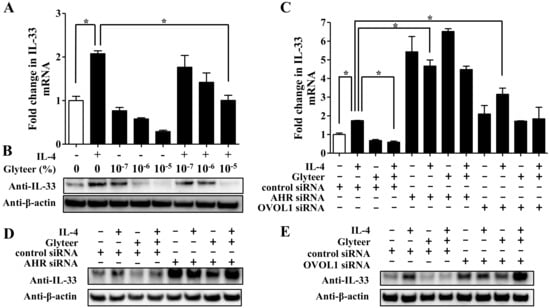 (A,B) NHEKs were treated with IL-4 (10 ng/mL) for 24 h in the presence or absence of Glyteer (10−7%, 10−6%, and 10−5%). (C,D) NHEKs transfected with si-control, siRNA against AHR (si-AHR), or si-OVOL1 were treated with IL-4 (10 ng/mL) for 24 h in the presence or absence of Glyteer (10−5%). (A,C) IL-33 expression was analyzed by qRT-PCR. Data are expressed as mean ± S.E.M.; n = 3 for each group; * p < 0.05. (B,D,E) IL-33 expression was analyzed by Western blotting with an anti-IL-33 antibody. The data are representative of experiments repeated three times with similar results.