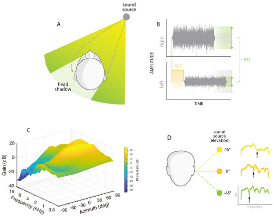 (A) An illustration of the acoustic head-shadow and the principle of time-delay between the two ears, dependent on the sound source. (B) Right and left temporal signals arriving from a right-leading sound source location. The ILD and ITD are illustrated on the amplitude and temporal domains, respectively. (C) The frequency and azimuth dependencies of the head and pinnae filter are shown. As the sound source moves from the hearing side (positive azimuth angles) to the deaf side (negative azimuth angles), the acoustic barrier created by the head attenuates high frequency signals contralateral to the source. Pinna gains are also observed for some frequencies at the ear ipsilateral to the source. (D) An illustration of the monaural spectral-pinnae cues as a function of the vertical position (elevation) of the sound source. The black arrows indicate the position-dependent frequency notch.