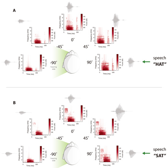 Comparison of the head-shadow and pinnae filtering for the words (A) ”Hat” and (B) “Sat” when presented at the deaf side. Spectrograms and sound waveforms (in gray) of the speech stimuli are shown for five corresponding azimuth positions. High frequency speech components are attenuated on the hearing side, erasing the unique informational marks that differentiate the words from each other.