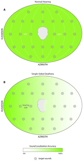 An illustration of spatial hearing abilities for (A) normal hearing and (B) single-sided deaf listeners. Normal hearing listeners localize target sounds accurately and precisely along the horizontal (azimuth) and vertical (elevation) planes. Monaural hearing listeners, instead, can localize target sounds mainly in the hemifield of the hearing ear, with impaired performance on the contralateral deaf side.