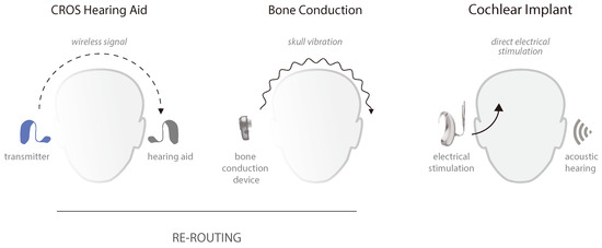 Traditional hearing rehabilitative options have relied on rerouting the acoustic signal from the deafened ear to the normal or better hearing ear for processing. Contralateral routing of signal (CROS) hearing aids have long been used to reroute the signal of interest to the better hearing ear. This is achieved by placing a microphone behind or in the deaf ear to collect the sound and transmit it wirelessly to a receiver worn in the better ear (Figure 4). CROS hearing aids offer a non-invasive approach to improving access to sound arriving from the deaf side for individuals with SSD. However, access can be an issue for many patients due to the associated high cost and inconsistent coverage for hearing aids globally. The need to wear a receiver in the normal hearing ear may also prove prohibitive, as it disrupts the natural acoustics of the ear, potentially reducing access to some sounds or modifying the monaural pinna cues that unilateral listeners become reliant on to help with directional hearing and the filtering of sounds [48,49]. Osseointegrated bone conduction implants provide an alternative to this, where a microphone on an external sound processor collects the sound and transmits it either percutaneously or transcutaneously (Figure 4) to an osseointegrated implant in the temporal bone of the deafened ear. The signal is then sent via the bones of the skull, where it travels transcranially to directly stimulate the normal hearing inner ear via bone conduction. This allows for the normal hearing ear to stay open and unoccluded, thereby maintaining the monaural spectral cues. In addition to requiring surgery, a limitation of bone conduction stimulation for the purpose of alleviating SSD is the reduction in signal level that may occur as it travels across the skull. This most significantly impacts high frequency cues and is even more prominent under transcutaneous (non-direct) stimulation of the bone.