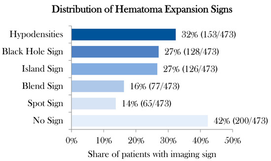 Distribution of simultaneous appearance of imaging markers for early hematoma expansion in patients with spontaneous intracerebral hemorrhage.