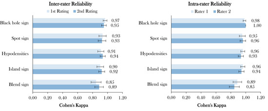 Inter- and intrarater reliability. Legend: Inter- and intrarater agreement of four noncontrast computed tomography imaging signs and spot sign on computed tomography angiography specified with stratified kappa with 95% confidence interval (CI) and listed in descending order; all p-values < 0.001.