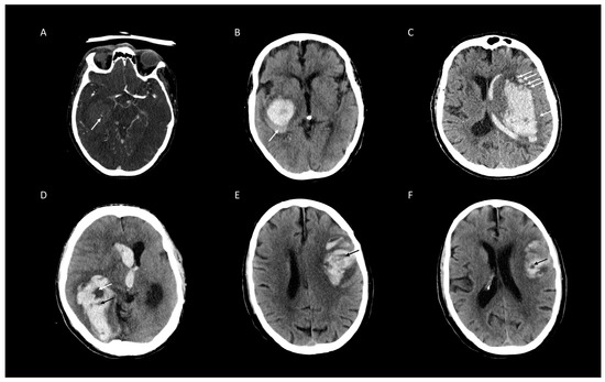 - Brouwers, H.B.; Goldstein, J.N.; Romero, J.M.; Rosand, J. Clinical applications of the computed tomography angiography spot sign in acute intracerebral hemorrhage: A review. Stroke 2012, 43, 3427–3432. [Google Scholar] [CrossRef][Green Version]