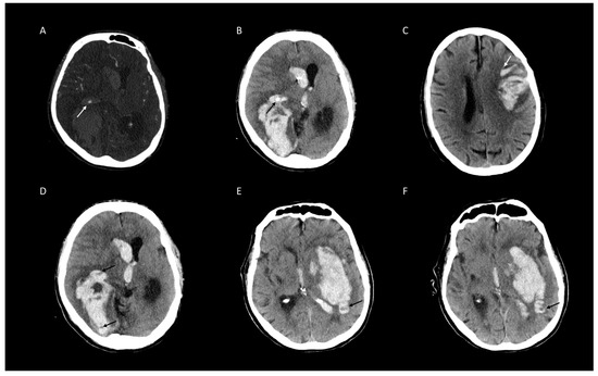 - Boulouis, G.; Morotti, A.; Brouwers, H.B.; Charidimou, A.; Jessel, M.J.; Auriel, E.; Pontes-Neto, O.; Ayres, A.; Vashkevich, A.; Schwab, K.M.; et al. Association Between Hypodensities Detected by Computed Tomography and Hematoma Expansion in Patients With Intracerebral Hemorrhage. JAMA Neurol. 2016, 73, 961–968. [Google Scholar] [CrossRef] [PubMed]