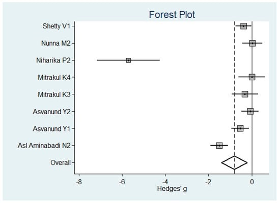 | Total | 315 | 315 | 100% | −0.82 | −1.42 to −0.22 | 0.008 | 71% (p = 0.001) | p = 0.180 | ||||