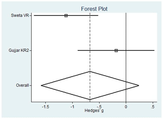 | Sweta VR [2] | 2019 | VAS | 25 | 1.28 ± 0.89 | 25 | 2.60 ± 1.38 | 52.3% | −1.12 | −1.72 to −0.52 | |||