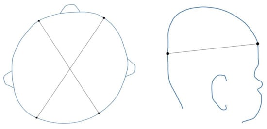 The severity of plagiocephaly can be categorized by the number of quadrants involved in the skull deformation and if there is a shift in the ear or eye placement [24]. Commonly used measurements of asymmetry are the Cranial Vault Asymmetry (CVA) and Cranial Vault Asymmetry Index (CVAI). The CVA is the absolute value of the difference of the cranial diagonals and CVAI is this CVA divided by the longer diagonal multiplied by 100. Therefore, the CVAI is a measurement of the CVA in relationship to the overall size of the head. Measurements are taken at the greater equator of the skull, as shown in Figure 1.
