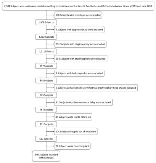 In total, 2104 charts were reviewed, and 500 subjects were included. Figure 2 shows the process of exclusion. Of the 1604 subjects whose charts were excluded, 198 had synostosis, four had scaphocephaly, 691 had plagiocephaly, 354 had brachycephaly, nine had hydrocephalus, three had nonasymmetrical brachycephaly head shapes, 81 had comorbidities or developmental delay, 33 were lost to follow up, 204 dropped out of treatment, and 27 were noncompliant.