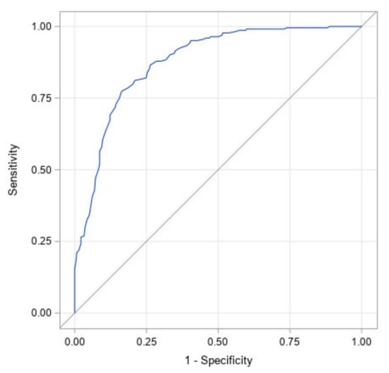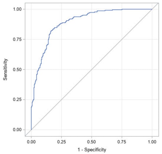 Receiver operating characteristic (ROC) curve for a model with all factors. Factors are: initial cephalic index (CI), initial cranial vault asymmetry index (CVAI), interaction between initial CI and CVAI, initial age, prematurity, and torticollis). The area under the curve is 0.89.