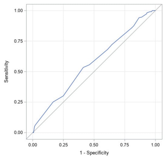 ROC curve for initial age only. The area under the curve is 0.57 (statistically significant with p = 0.002).