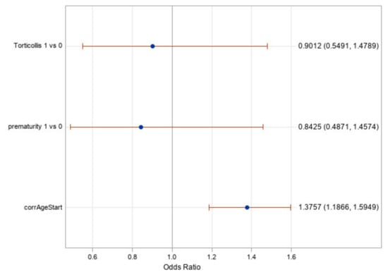 Odds ratios with 95% confidence intervals for torticollis, prematurity, and corrected age at start of treatment.