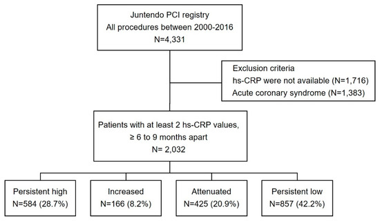 Inflammation plays an important role in promoting endothelial cell damage and the progression of atherosclerosis, which triggers coronary artery disease and adverse cardiovascular events [6,7]. Among several inflammation parameters, the C-reactive protein (CRP) is widely considered a valuable predictor of CAD [8]. There have been many reports on the association between CRP values and adverse clinical outcome, and CRP has been established as an independent predictor of cardiovascular events [9,10,11,12]. However, CRP concentrations vary in ethnic groups, with especially lower levels documented in Asian populations [13,14]. Recently, residual inflammatory risk (RIR) has been considered more important than before, because interventions to address inflammation could reduce CVD risk [15]. Kalkman et al. showed that patients with persistent high RIR had higher all-cause mortality in patients undergoing percutaneous coronary intervention (PCI) at 1-year follow-up [16]. However, the long-term clinical impact of different patterns of RIR in stable CAD patients after PCI remains unclear for Asian populations.