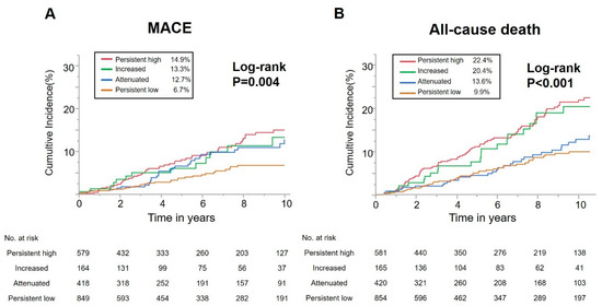 The endpoints of this study were all-cause death and major adverse cardiac events (MACE), defined as a composite of cardiovascular death, non-fatal myocardial infarction (MI) and non-fatal cerebral infarction (CI). Survival data and information about the incident were obtained by serial contact with patients and were assessed from the medical records of patients. Mortality data were collected from the families of patients who died at home, and details of events associated with cause of death were supplied by other hospitals or clinics to which the patient had been admitted. All data were collected by blinded investigators. Cardiovascular death was defined as death caused by myocardial infarction, heart failure, or sudden death. Time to event was measured from the second hs-CRP measurement.