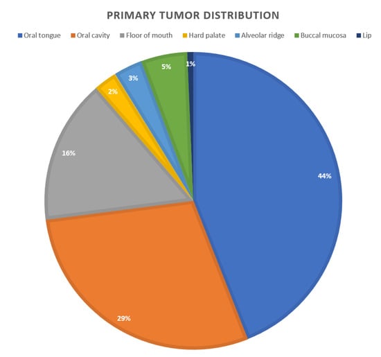 | Oral tongue | 16 (57%) | 11 (50%) | 23 (50%) | 8 (38%) | 1 (50%) | 21 (62%) | 0 |