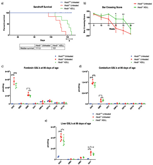 The following are available online at https://www.mdpi.com/2077-0383/9/4/1050/s1, Figure S1: Total GSL levels at 12 weeks in Hexb-/- mice with and without treatment. Wild-type untreated (Hexb+/+), Sandhoff untreated (Hexb-/- UT), ADLL treated (Hexb-/-ADLL). Hexb+/+(n = 2), five animals for Hexb-/- UT and Hexb-/-ADLL, mean ± SD (two-way ANOVA).