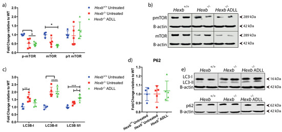 Effect of acetyl-DL-leucine on autophagy in the cerebellum of 12-week-old Hexb-/- mice. Wild-type untreated (Hexb+/+), Sandhoff untreated (Hexb-/- UT), ADLL (Hexb-/-ADLL). In total, four animals for Hexb+/+, and five animals for Hexb-/- UT and Hexb-/-ADLL. Proteins of interests were probed by Western blot and normalized to β actin. Fluorescence values were obtained with Fiji software and calculated relative to Hexb+/+. (a) mTOR, p-mTOR expressions and mTOR p:T rations, mean ± SD * p < 0.05, (two-way ANOVA). (b) Western blot images of p-mTOR and mTOR proteins and their β-actin loading controls. (c) LC3-I, LC3-II expressions, and ratio of LC3-II versus LC3-I, mean ± SD, *p = 0.0483, ** p = 0.0011, *** p = 0.0006, **** p < 0.0001 (two-way ANOVA). (d) p62 levels, mean ± SD (one-way ANOVA). (e) Western blot images of LC3s and p62 with their β-actin loading controls. Samples on the same blots were cut (inserted lines) for appropriate visual representation.