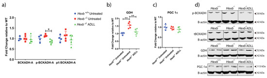In addition to the known effects of the branched chain amino acid leucine on mTOR [26] and autophagy [27,28], leucine also plays a role in glutamine and glutamate utilisation when glucose metabolism is deficient/impaired [29,30]. Leucine catabolism provides a source of acetyl CoA [31]. Therefore, we investigated levels of branched chain keto acid dehydrogenase E1 alpha polypeptide (BCKDHA), which regulates the final step of leucine catabolism to acetyl CoA [32]. No difference in BCKDHA protein levels were found between Hexb+/+ and Hexb-/- in the absence or presence of ADLL treatment (Figure 3a,d). There were also no statistical differences between healthy and diseased mice with regard to the inactive phosphorylated form of BCKDHA, or its p:T ratio (Figure 3a,d). Although ADLL decreased p-BCKADH levels significantly (24.3%, p = 0.0494), the absence of a change in its p:T ratio indicated that ADLL did not directly impact on BCKDHA activity (Figure 3a,d). Therefore, although there was a trend towards BCKADH activation with ADLL treatment, indicating enhanced ADLL catabolism, it failed to reach statistical significance.