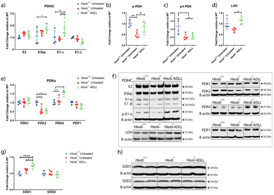 By examining subunits of the pyruvate dehydrogenase complex (PDHC), we found no change in the expression of subunits E2, E3bp, E-α and E1-β in untreated Hexb-/- cerebellum compared to Hexb+/+ mice (Figure 4a,f). However, E1-α subunit levels were increased by ADLL treatment in Hexb-/- mice compared to both Hexb+/+ (41.1%, p = 0.0097) and Hexb-/- (48.8%, p = 0.0010) (Figure 4a,f). Considering PDH is negatively regulated by phosphorylation of its E1-α subunit [36], evidence of increased PDH activation in untreated Hexb-/- mice was indicated by significantly lower levels of p-E1-α (50.8%, p = 0.0062) (Figure 4b,f), compared to their Hexb+/+ counterparts (55.9%, p = 0.0136) (Figure 4c,f).