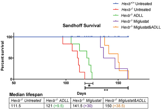 Evaluation of lifespan in miglustat alone or miglustat plus ADLL combination therapy in Hexb-/- mice. Wild-type (Hexb+/+) untreated (blue line), n = 5; Sandhoff (Hexb-/-) untreated (red line), n = 6; Sandhoff (Hexb-/-) ADLL treated (green line), n = 6; Sandhoff (Hexb-/-) miglustat treated (purple line), n = 4; Sandhoff (Hexb-/-) miglustat and ADLL treated (orange line), n = 5; changes in life expectancy (%). Mean ± SD, * p = 0.0247, ** p < 0.0039 (log-rank test). Median survivals are indicated in the table.
