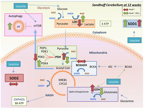 Summary of ADLL treatment effects on the Hexb-/- mouse cerebellum at 12 weeks of age. Investigated pathways that leucine can affect are displayed. Red arrows indicate the alterations in untreated Hexb-/- mice, while green arrows indicate the effect of pre-symptomatic ADLL treatment.