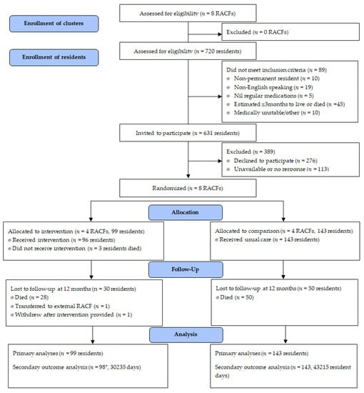 Across the 8 RACFs, 242 residents were recruited including 99 from intervention facilities (Figure 1). Study participants were taking a median of nine regular daily medications (interquartile range (IQR) 6–12) (Table 1).