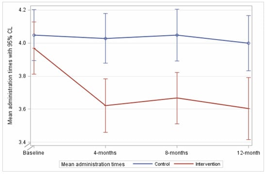 The mean number of medication administration times in 24 h during follow up in the intervention and comparison arms.