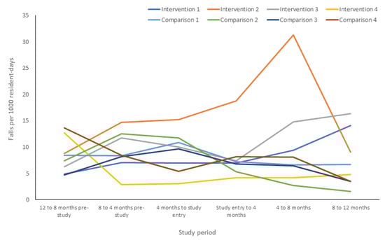 Fall rates differed between time periods, with fall rates peaking between the 4–8 month period post-study entry in the intervention arm and returning close to baseline at 12 month follow up (Figure 3). A simultaneous sustained decrease in fall rate in the intervention arm was also observed throughout follow up (Figure 3). When stratified by RACF, considerable variation in fall rates among participants in each facility was observed in the 12 months before and after study entry (Figure 4). The increase in fall rate at 4–8 month follow up in the intervention arm was primarily driven by falls at one intervention RACF, where the fall rate peaked at 31.3 falls per 1000 resident days at 4–8 month follow up and dropped to 9.1 falls per 100 resident days at 8–12 month follow up (Figure 4). This intervention RACF was matched with a comparison RACF with a very low fall rate at 12 month follow up (1.6 falls per 1000 residents).