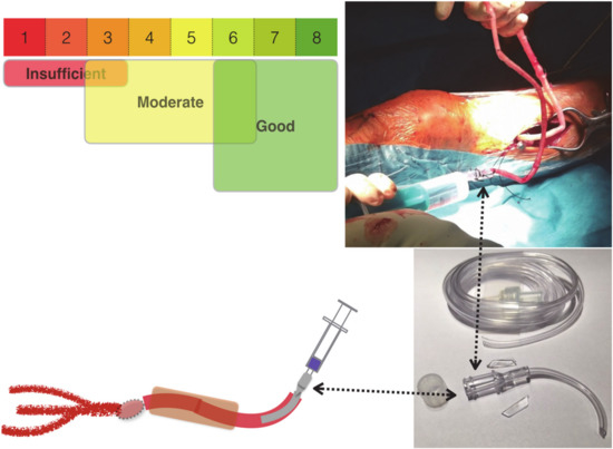 The figure shows the equipment that is necessary for the cannulation of the vein when harvesting it for the bypass surgery. The cannula is easy to prepare by cutting off a 3 cm segment of a standard cannula. The set can be used by the surgeon for flushing the bypass and checking the outflow (subjective scale: good, moderate, or poor) and, if needed, for hydrostatic bypass flow assessment.