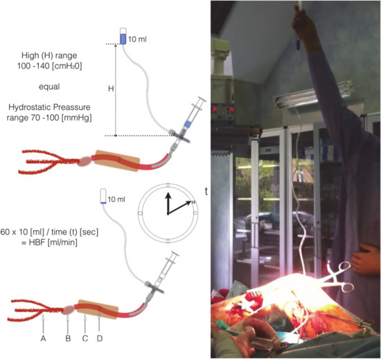 Hydrostatic bypass flow (HBF) uses the same cannula as SRA but expands it with an extra tap and drip (see Figure 2). The measurement of the HBF is based on a simple calculation: HBF = 60/t × 10 [mL/min]. Where (t) is the transfusion time of 10 mL of normal saline through the bypass under the hydrostatic pressure. The hydrostatic pressure is around 70–100 mmHg and is produced by a water column (H) in the drip. A water column of 100 cm produces about 70 mmHg of pressure (1 mmHg = 13.6 cm H2O). To perform the measurement, the container of the drip must be prefilled with 10 mL saline.