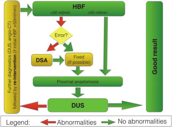 Digital Subtraction Angiography (DSA) was used if the HBF measurement revealed any flow impairment and the surgeon did not recognize the problem right away. As presented in the algorithm in Figure 3. We used a mobile-C-Arm (Ziehm Vision RFD Imaging GmbH. Donaustrasse 31, 90451 Nuremberg, Germany; serial number 20498). The mean volume of the contrast was 15 mL (Visipaque; Joxidanolum 652 mg/mL, GE-Healthcare AS, Oslo, Norway). Subjective runoff assessment (SRA) was used in the control group. In the examined group, DSA, HBF, and DUS were used algorithmically (Figure 3).