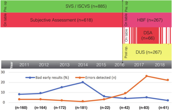 The introduction of the HBF technique increased the number of intraoperatively detected errors (Figure 4). We noticed a significant improvement of our early results. The percentage of failed cases decreased from 8.6% to 3.7% (p = 0.023), and the percentage of detected errors increased from 2.3% to 17.6% (p = 0.00001). However, the statistical difference between the control and the examined group decreased in the last few years due to the constantly decreasing number of open bypass surgeries.