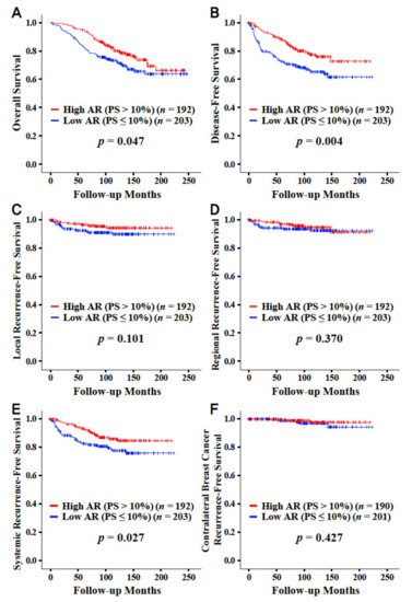 The high AR expression group showed both superior overall survival (p = 0.047) and disease-free survival (p = 0.004) when compared with the low AR expression group (Figure 1). The high AR expression group showed better systemic recurrence-free survival (p = 0.027; Figure 1E). No significant survival differences were observed when considering local, regional, and contralateral breast cancer recurrence. The detailed survival rates for overall survival and disease-free survival are described in Table S1.