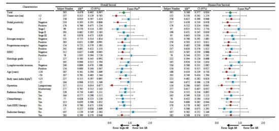 Subgroup analysis of the Cox proportional hazards model according to the expression level of AR (proportion score with the cut-off value of 10%) regarding overall survival and disease-free survival. Abbreviation: AR, androgen receptor; CI, confidence interval; HER2, human epidermal growth factor receptor 2; HR, hazard ratio. a) HRs are the relative risks of the high AR group (proportion score >10%) with reference to the low AR group (proportion score ≤10%) by Cox proportional hazards model. b) In the forest plot, an HR value of less than 1 favors the high AR group against the low AR group. The red circles mean statistical significance and the blue squares mean no statistical significance. The green diamond means the result of total subjects.