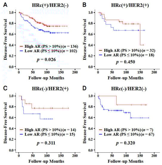 High AR expression was a significant favorable prognostic factor for overall survival in all of the subjects and subgroups with a tumor size of ≤2 cm, a negative node, a positive ER, a negative HER2, a histologic grade 1 or 2, a body mass index ≤25 kg/m2, a lumpectomy, and endocrine therapy (Figure 2). High AR expression was a significant favorable prognostic factor for disease-free survival in all of the subjects, and it was a significant favorable prognostic factor regardless of the nodal positivity and operation type. AR was also a significant prognostic factor in subgroups with a tumor size of >2 cm, stage II cancer, a positive ER, a negative PR, a negative HER2, a histologic grade 1 or 2, a positive lymphovascular invasion, age ≤50 years, a body mass index ≤25 kg/m2, no radiation therapy, chemotherapy, no anti-HER2 therapy, and endocrine therapy. High AR expression was a significant favorable prognostic factor for disease-free survival in the HRc(+)/HER2(−) breast cancer subgroup only (p = 0.026; Figure 3). AR was not a significant prognostic factor for overall survival in any of the breast cancer subtypes (Figure S4).