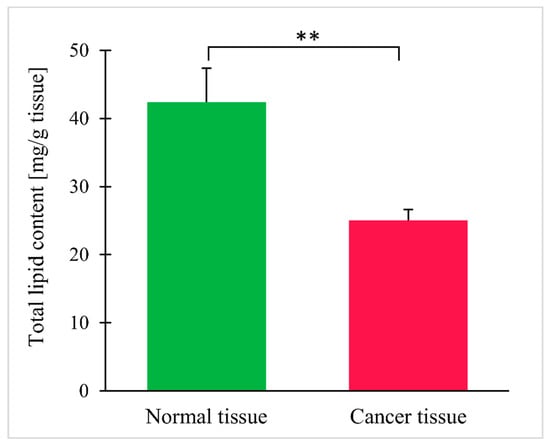 Total lipid content in normal and colorectal cancer tissue. Values are mean ± SEM; ** p < 0.01, n = 25.