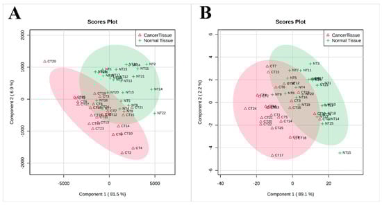 PLS-DA scores scatter plots obtained for normal and cancer tissue 1H-NMR spectra (A) and GC-MS analysis (B); n = 25.