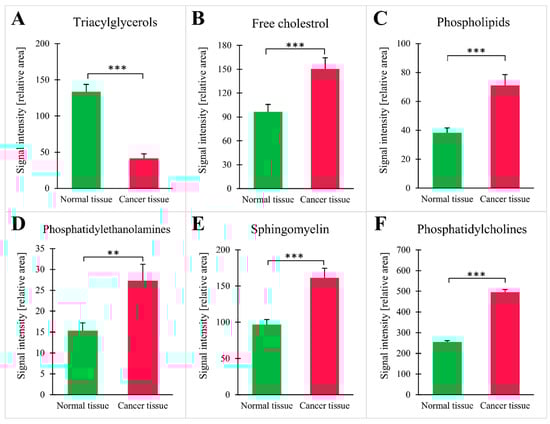 Total lipid content in cancer tissue turned out to be lower than in normal tissue (Figure 2). The results for each individual patient are shown in the supplementary file (Figure S1).