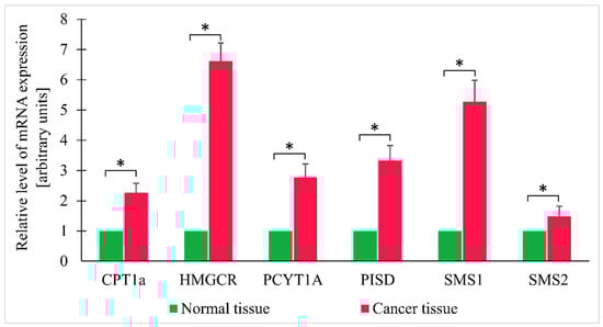 Since the findings reported above pointed to likely increase in TG oxidation and enhanced synthesis of membrane lipids in cancer tissue, the expressions of genes encoding key enzymes involved in FA oxidation (CPT1a—carnitine palmitoyl-CoA transferase 1a), cholesterol synthesis (HMGCR—HMG-CoA reductase), PC synthesis (PCYT1A—choline-phosphate cytidylyltransferase A), sphingomyelin ((sphingomyelin synthase 1 and 2—SMS1 and SMS2), and phosphatidylethanolamine (phosphatidylserine decarboxylase—PISD) were determined as well. Cancer tissue turned out to contain elevated levels of mRNA for all the enzymes mentioned above (Figure 5).