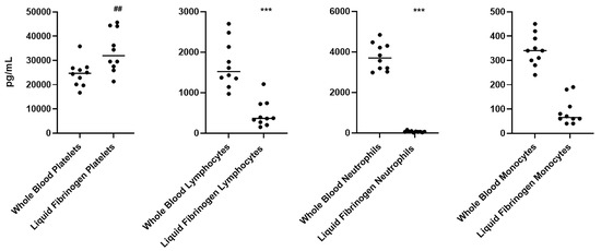 At the time of collection, a complete blood count for all volunteers was carried out. Red blood cells, white blood cells, and platelets were counted in both whole blood and liquid fibrinogen, finding a statistically significant mean accumulation of platelets of almost 1.5-fold in liquid fibrinogen compared to whole blood samples (p < 0.01). No accumulation of all other blood cells was found in the liquid fibrinogen, rather a statistically significant decrease was observed for lymphocytes and neutrophils (p < 0.001) and a not statistically significant decrease of monocytes compared to whole blood samples (Figure 2).