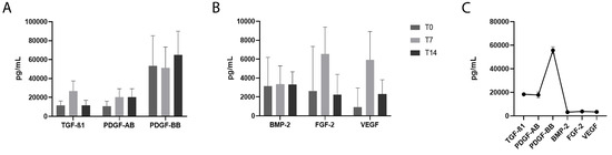 Growth factors’ release by liquid fibrinogen. The release of growth factors TGF-β, PDGF-AB, and PDGF-BB in (A), BMP-2, FGF-2, and VEGF in (B), was measured by ELISA at the moment of sample collection (T0), 7 days after collection (T7), and 14 days after collection (T14). The cumulative concentration of each factor, considering the 10 samples, calculated at T14 is reported in (C). TGF-β1, transforming growth factor beta 1; PDGF-AB, platelet-derived growth factor-AB; PDGF-BB, platelet-derived growth factor-BB; BMP-2, bone morphogenetic protein 2; FGF-2, fibroblast growth factor 2; VEGF, vascular endothelial growth factor.