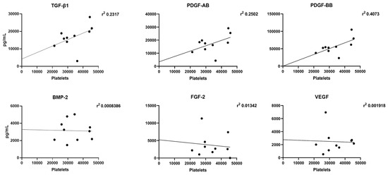 In order to verify the presence of a correlation between growth factor release and platelet count, a statistical analysis for each donor was performed. TGF-β1, PDGF-AB, and PDGF-BB levels correlated to platelet accumulation (r2 = 0.2317, r2 = 0.2502, and r2 = 0.4073, respectively), whereas, no correlation between BMP-2, FGF-2, and VEGF levels and platelet accumulation was found (r2 = 0.0008, r2 = 0.0139, and r2 = 0.0019, respectively) (Figure 4).