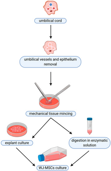 Isolation of cells from Wharton’s jelly may be performed with the use of two different methods, namely, explant method or enzymatic digestion. In both cases, the umbilical epithelium and vessels are initially removed, while the residual tissue is mechanically fragmented. The tissue pieces are placed directly on the culture vessel in the explant method, which results in the cell outgrowth on the plastic surface. In the enzymatic method, the tissue pieces are first digested in the enzymatic solution, and after that the cells released from the tissue are centrifuged, suspended in the culture medium, and seeded in the culture vessels.