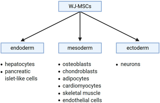 Taken together, the aforementioned findings illustrate a broad differentiation capacity of WJ-MSCs towards the cells of all three primary germ layers, as indicated in the diagram of Figure 3.